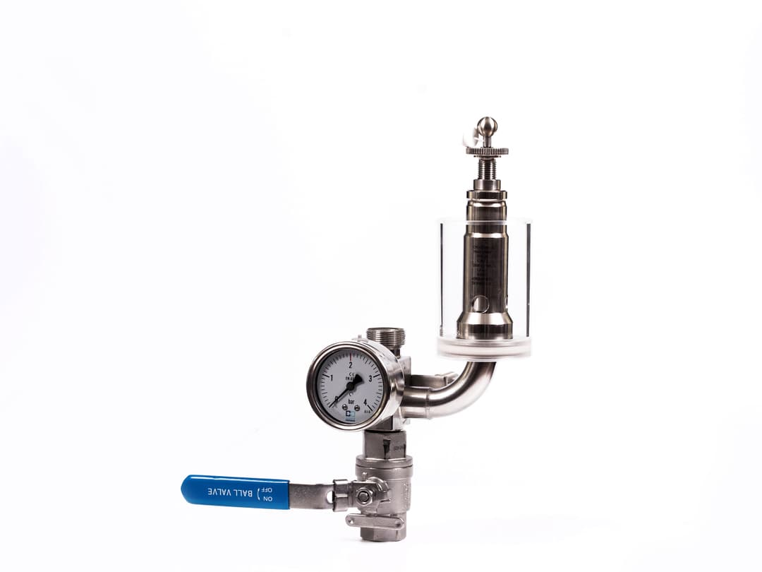 The sanitary bell enables automatic washing (with water, sanitising solution) of the air piping of the lager tank, the pressure bunging apparatus and the sampling valve in one operation
